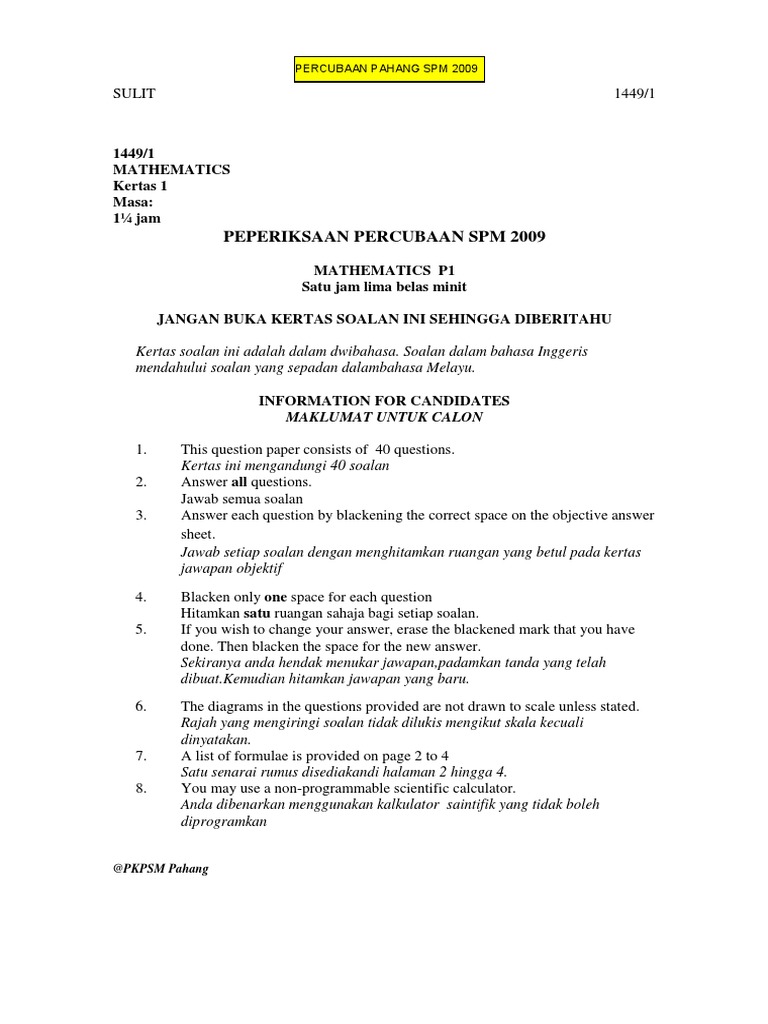 Kertas Jawapan Pahang Trial Exam Paper Untuk Matematk
