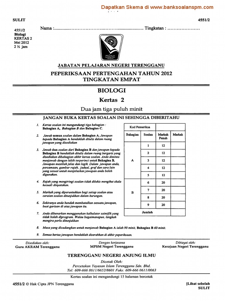 Biologi Kertas 2 Ting 4 Pertengahan Tahun 2012 Terengganu