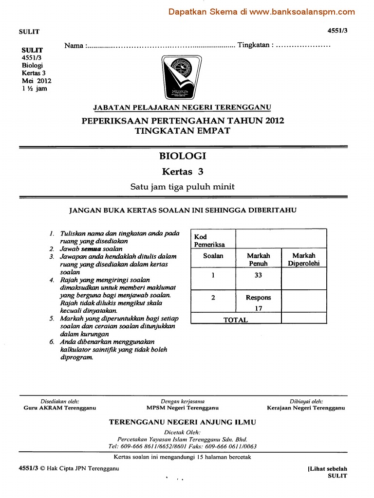 Soalan Biologi Tingkatan 4 Dan Skema Jawapan Terengganu N