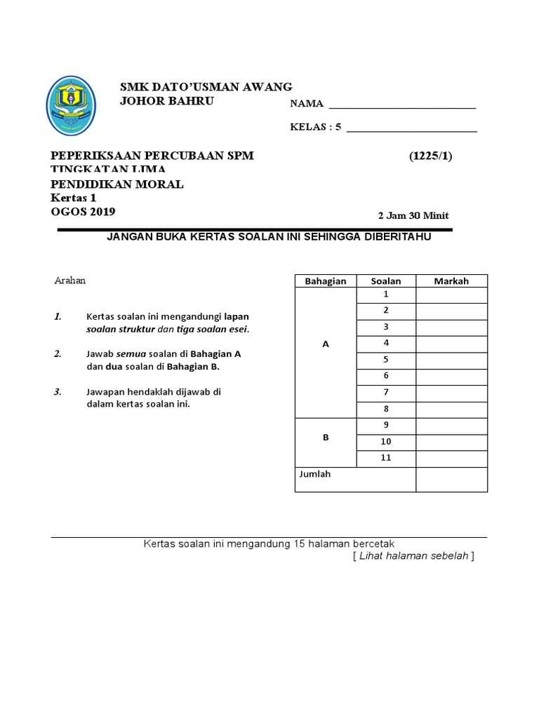Koleksi Soalan Percubaan Pendidikan Moral Spm 2020 2019 2018