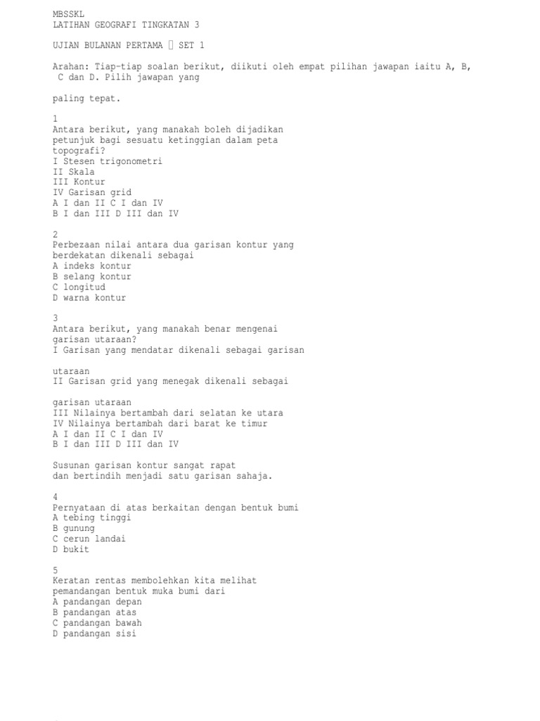 Contoh Soalan Pilihan Jawapan Geografi Tingkatan 3 Aras Rendah