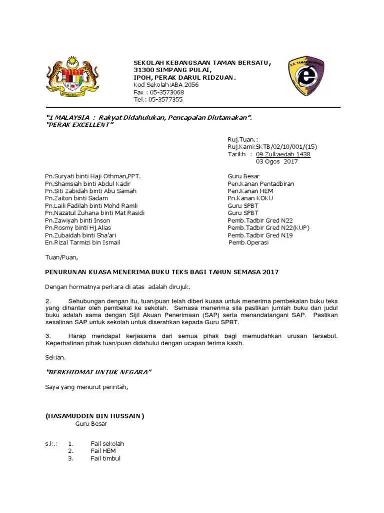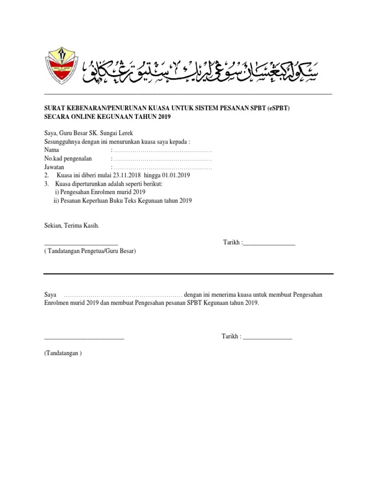 Contoh Surat Penurunan Kuasa Penerimaan Buku Teks