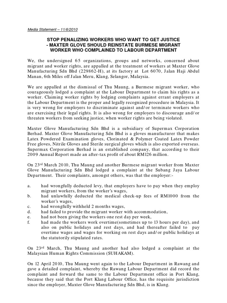 Stop Penalizing Workers Who Want To Get Justice Maxter Glove Should Reinstate Burmese Migrant Worker Who Complained To Labour Department Migrant Worker Labor Rights