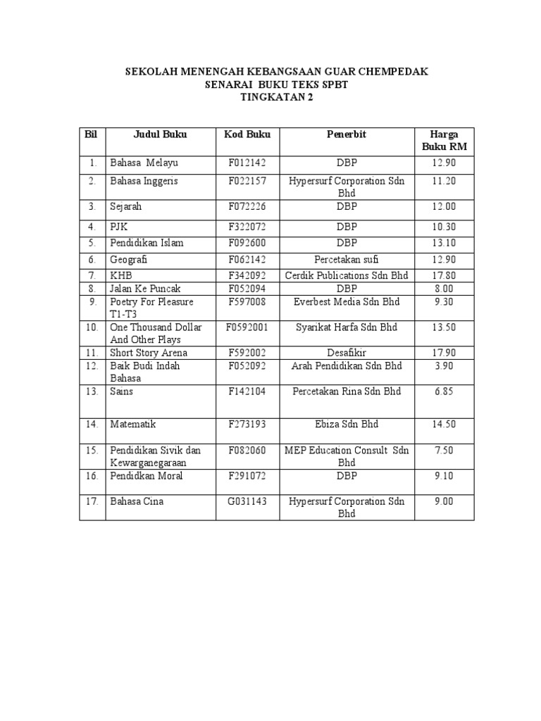 Spbt Smk Taman Tun Fuad Kota Kinabalu Senarai Buku Teks