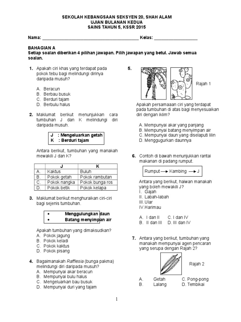Soalan Peperiksaan Penggal 1 Sains Tahun 5 Kssr Dengan Jawapan