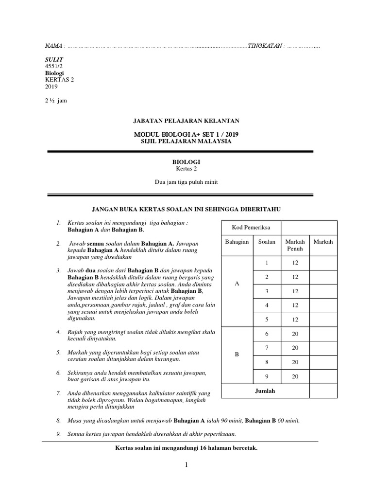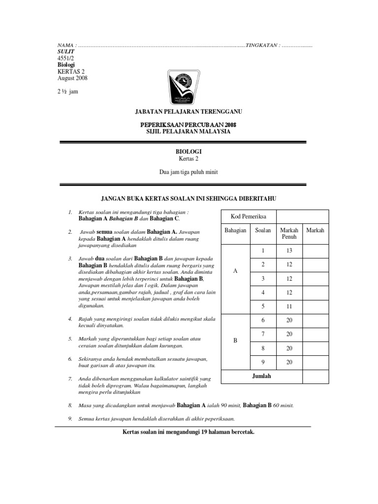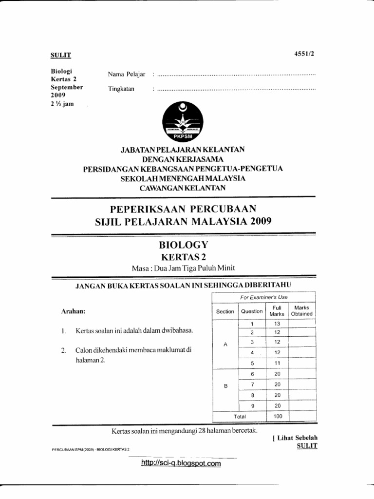 Peperiksaan 4551 2 Biologi Kertas 2 Jabatan Pelajaran Kelantan Jawapan