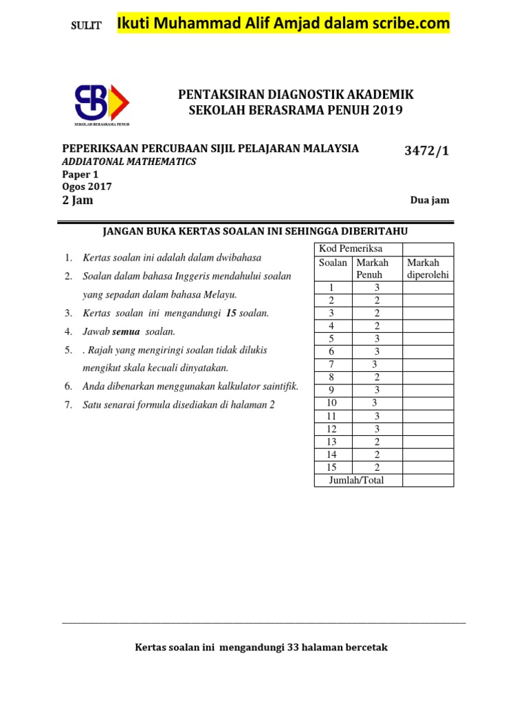 Trial Sbp Spm Addiatonal Mathematics 2019