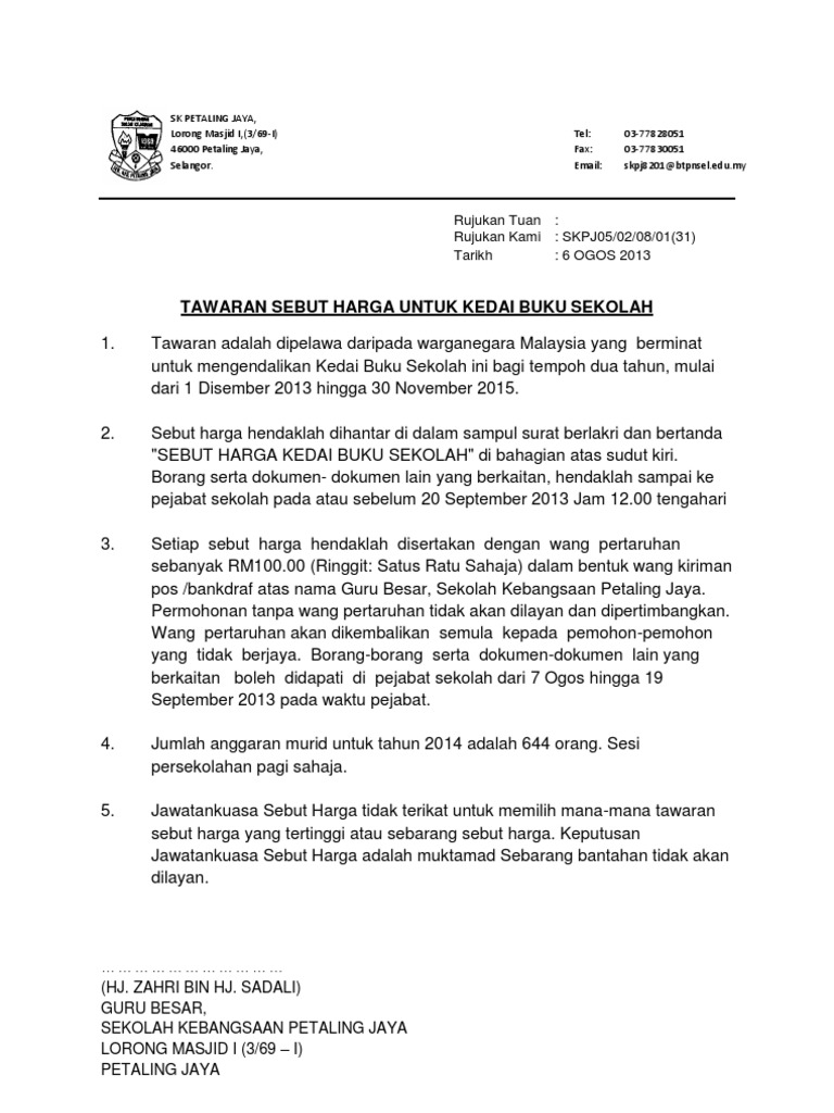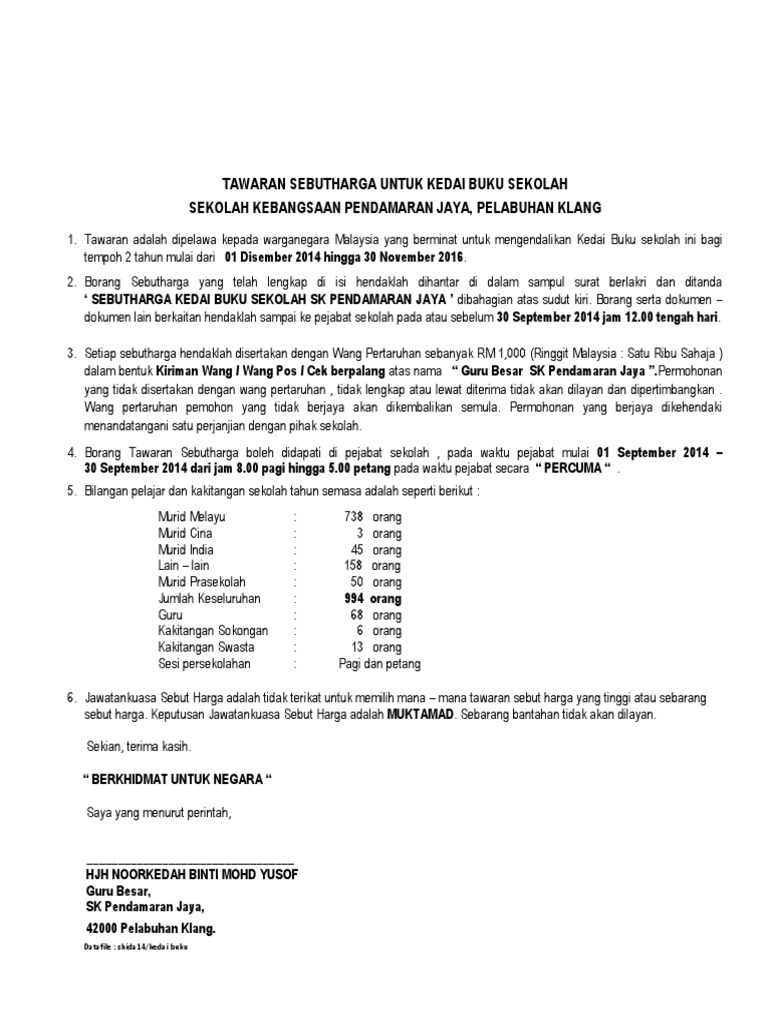 Borang Sebut Harga Kedai Buku Sekolah Kosong Doc Document