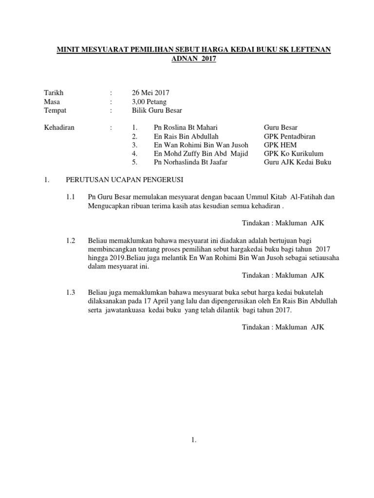 Minit Mesyuarat Pemilihan Sebut Harga Kedai Buku Sk Leftenan Adnan 2017