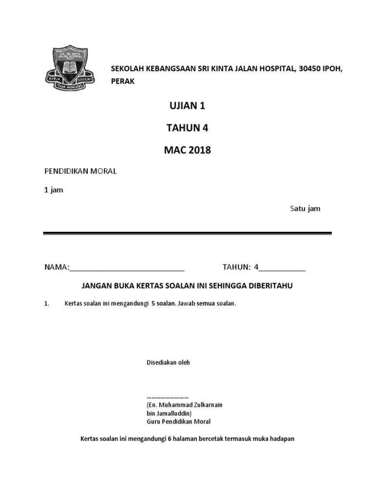 Soalan Peperiksaan Awal Tahun Pendidikan Moral Tahun 4 Ujian Bulan Mac 2018 Cikgu Ayu