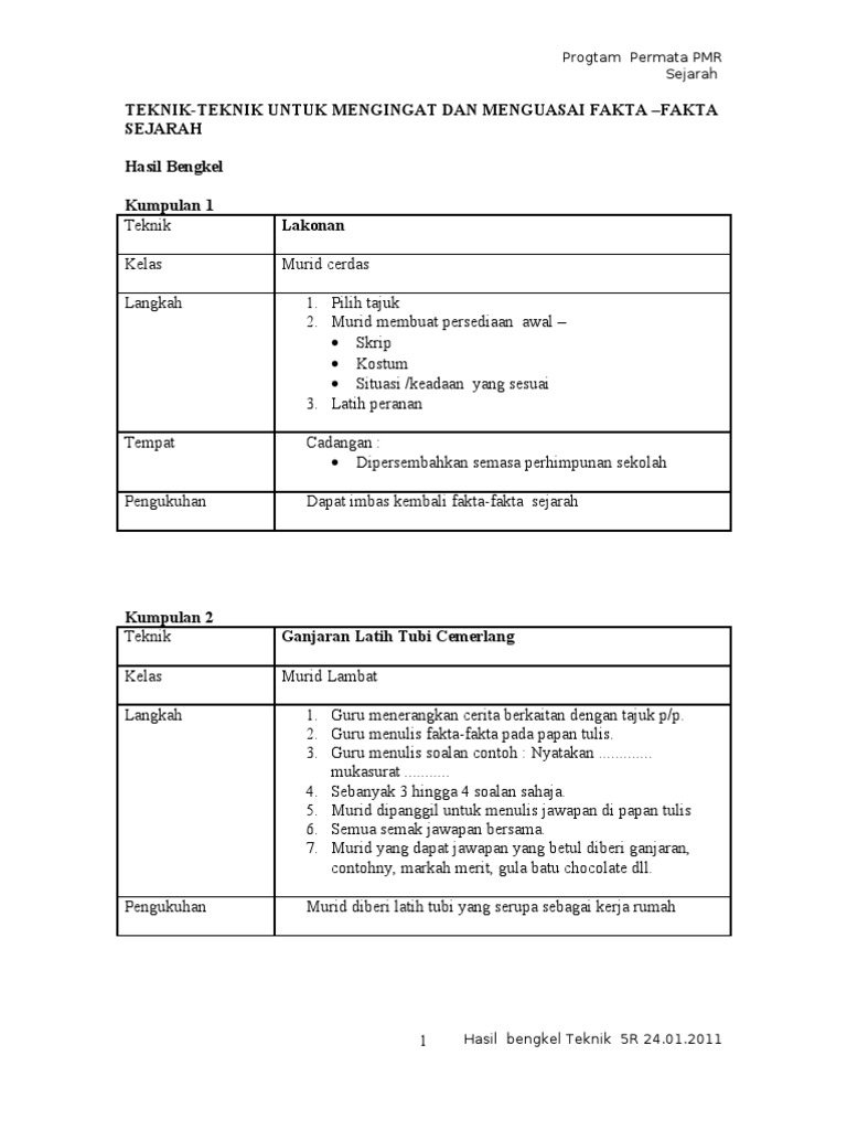 Teknik Teknik Untuk Mengingat Dan Menguasai Fakta Fakta Sejarah Hasil Bengkel Kumpulan 1 Lakonan