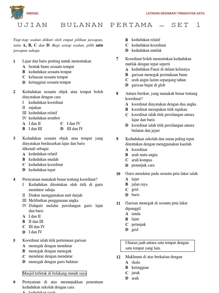 Soalan Ujian 1 Geografi Tingkatan 1 2017