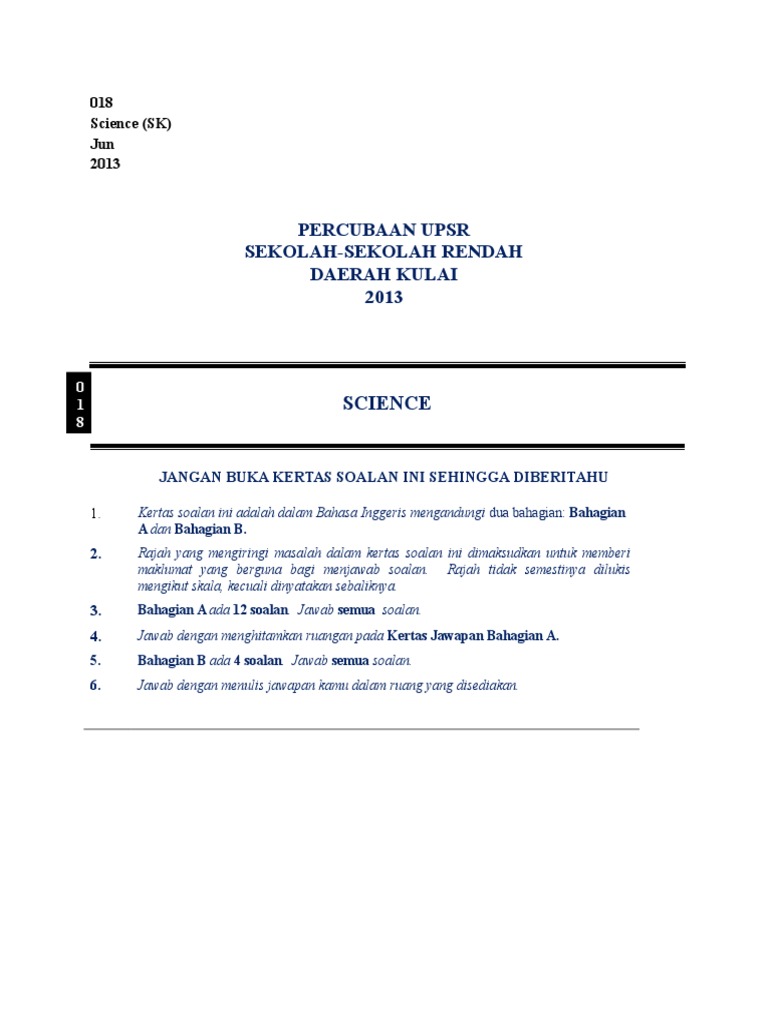 Percubaan Upsr Sekolah Sekolah Rendah Daerah Kulai 2013 Science